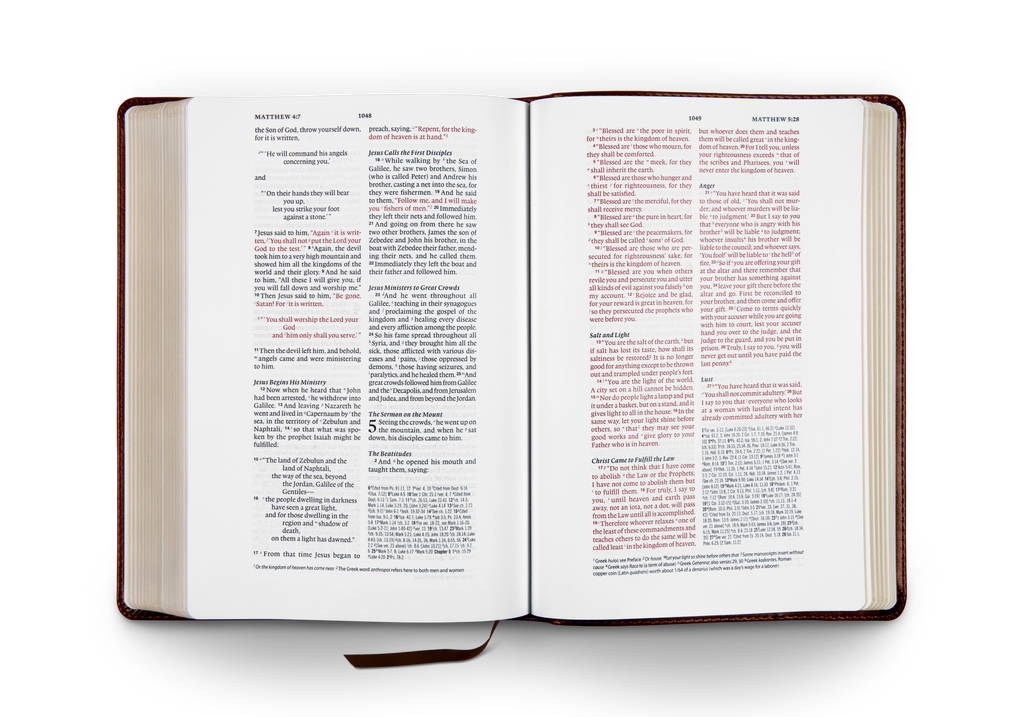 The ESV Wide Margin Reference Bible is perfect for those who interact closely with the Bible text. It features generous, 1-inch margins on either side of the text, providing plenty of room for personal note-taking. Other features include a concordance, full-color maps, and cross-references located in the corner of each page. This edition is ideal for all who want to record notes, thoughts, or prayers in their Bible.