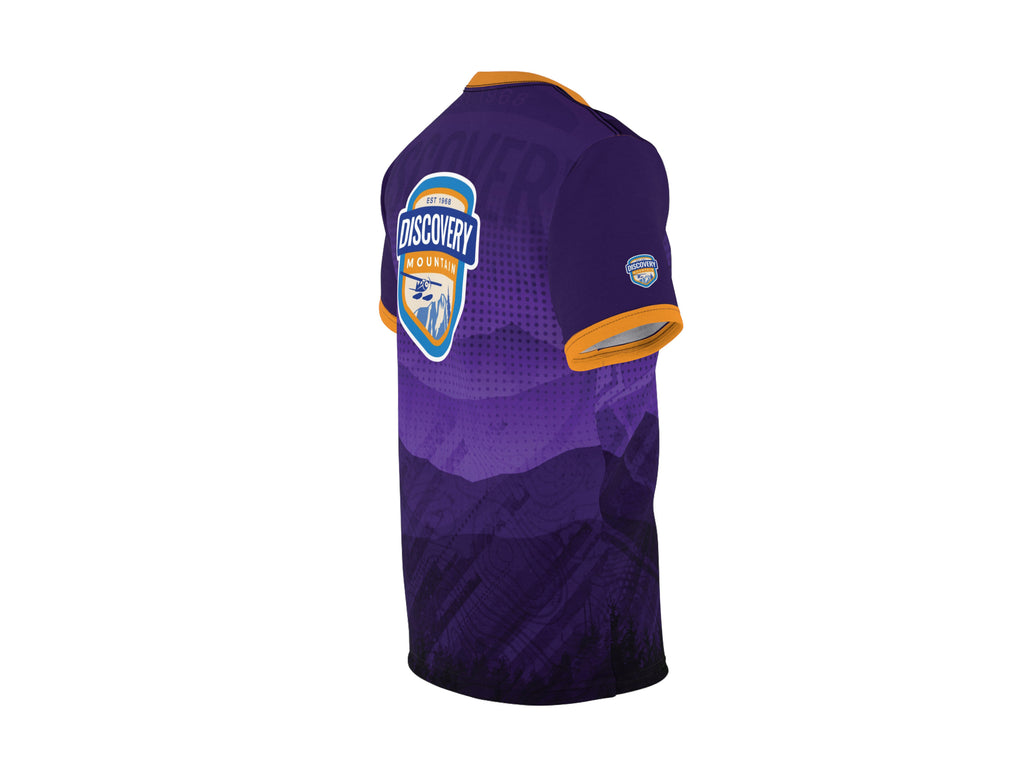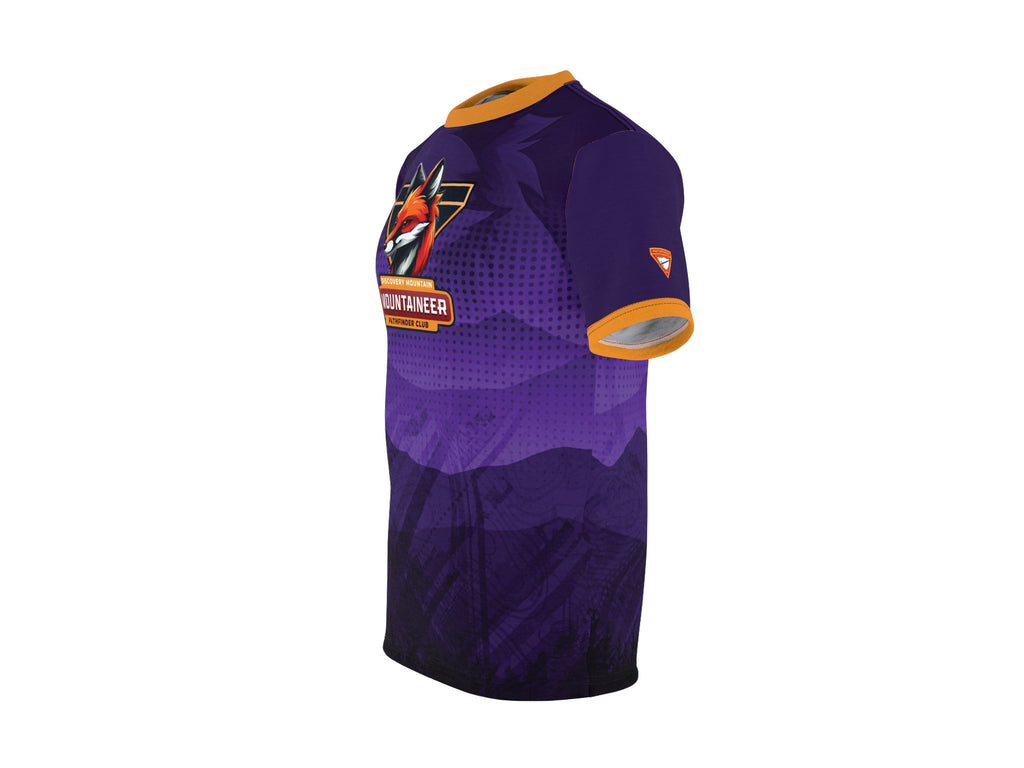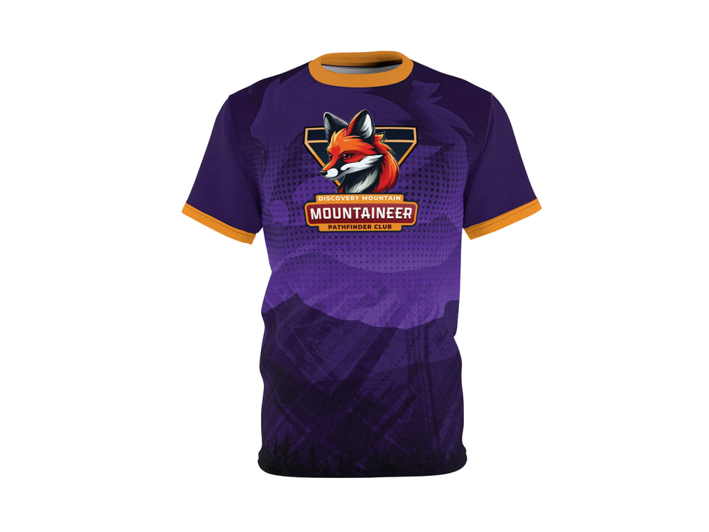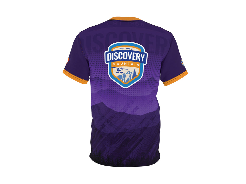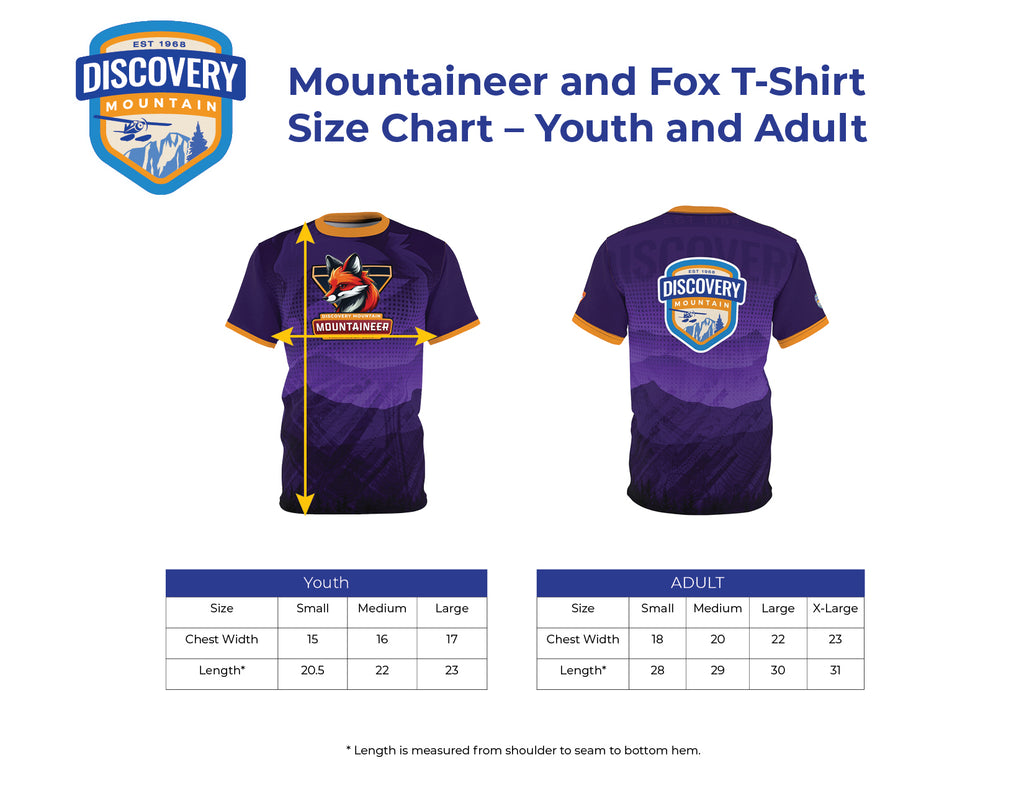 This royal purple shirt features a Mountaineer insignia with a fox mascot on the front and a Discovery Mountain logo on the back. It’s made with polyester fabric (like a soccer jersey) and specially fitted for women/girls. (If you need a fit for men/boys, check out our blue/mountain man version.) It’s great for activewear—for climbing a mountain, playing capture the flag, oatmealing, etc.—but versatile enough for daily use. Don’t miss your chance to grab a Discovery Mountain shirt like no other!