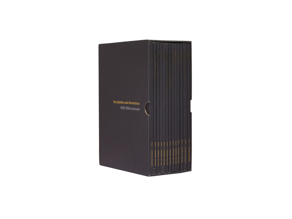 The Epistles and Revelation box set of NKJV Bible Journals includes 13 volumes covering 22 books of the New Testament: Romans, 1-2 Corinthians, Galatians, Ephesians, Philippians, Colossians, 1-2 Thessalonians, 1-2 Timothy, Titus, Philemon, Hebrews, James, 1-2 Peter, 1-3 John, Jude, and Revelation.