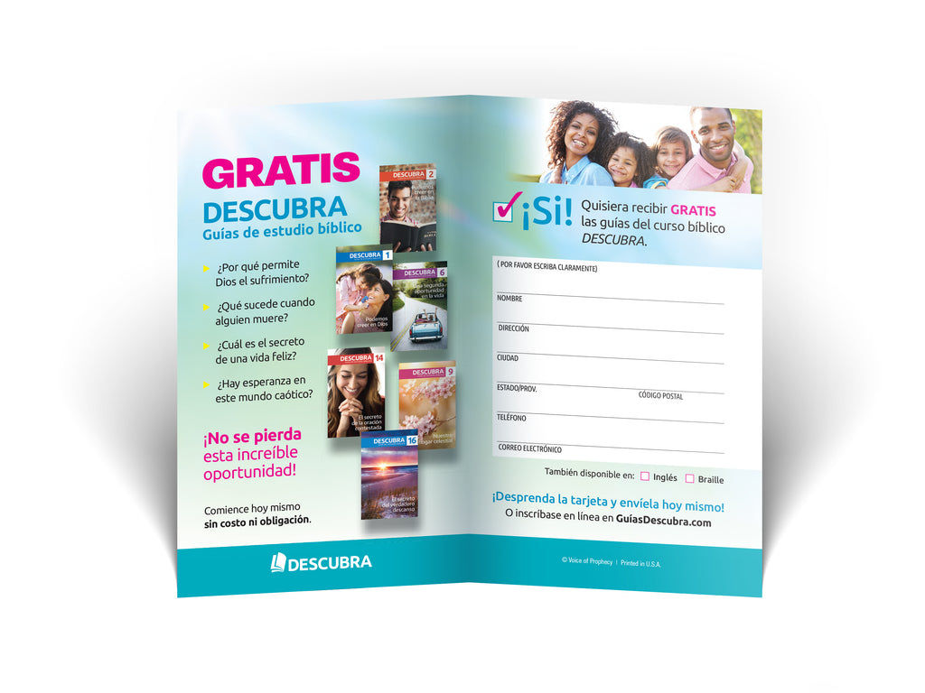 These two-panel invitation cards are a perfect way to encourage your friends, family, and acquaintances to enroll in the Discover Bible School. These cards may be purchased with or without the VOP address.