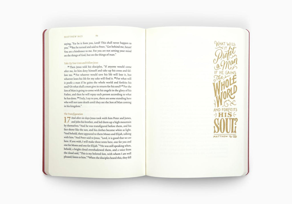 ESV Illuminated Scripture Journals pair the entirety of individual books of the Bible with a lightly dotted blank page opposite each page of Bible text, providing space to creatively engage with and reflect on the Word of God. Hand-lettered, gold-ink illustrations by renowned artist Dana Tanamachi are interspersed throughout the blank pages, inviting readers to add their own artwork or reflections to each page. These thin, portable notebooks have unique covers stamped with gold-foil and are great for art journaling, personal Bible reading and prayer, small-group Bible study, or taking notes through a sermon series.